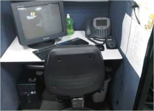 Como observamos en la gráfica el espacio laboral es muy reducido y mal organizado para el trabajo especifico noten el teclado y el monitor (esperen ver los modelos indues de CATs) la silla no es adecuada, la pantalla de visualización no es la mejor (en algunos casos vi monitores a solo 45 cm de los ojos del operador, así mismo dada la juventud de los operadores las malas posturas están a la orden del día y lo peor es que no son corregidos, la sedentacion prolongada se observa en casi todos los casos (6 horas por jornada). La implantación de pausas activas es fundamental que rompan la monotonía de la actividad laboral son OBLIGATORIAS (con solo 2-5 minutos 2 veces al día es suficiente para jornadas de 6 horas).