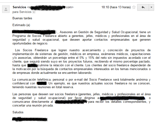 Supongo que algunos de ustedes que leen este post recibieron ese correo, algunos tendrán dudas otros lo deben de haber borrado, yo simplemente me puse a leer y analizar lo pintoresco del contenido ya que de verdad es un claro ejemplo de marketing de alcantarilla que en vez de buscar generar beneficios para todos solo busca el lucro financiero de unos cuantos, en Venezuela se llama soborno y a nivel gubernamental está penado por la ley. No se en Perú de donde es la “empresa” que lo envía como se llama esta acción que promueven como SOCIOS FREELANCE, de verdad el que ideo esta campaña demuestra poca creatividad y una excesiva estupidez al enviar esto de manera masiva, sin prever el impacto negativo que le generara a futuro a esta «Empresa».