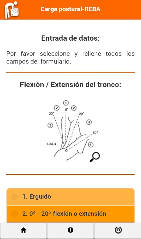 La aplicación de carga postural es sencilla y muy intuitiva, ademas declara la muerte de la hoja de excel para calcular el método REBA ahora se hará en el móvil, así como también el calculo de flexión y extensión de cuello entre otras.