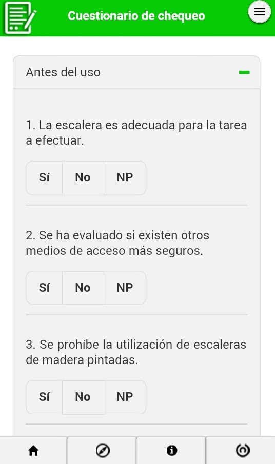 La ultima aplicación es la de escaleras manuales que esta muy completa y su valor agregado esta en Español he usado por años la misma aplicación en ingles desarrollada por el NIOSH de USA y esta me parece mas dinámica y completa.