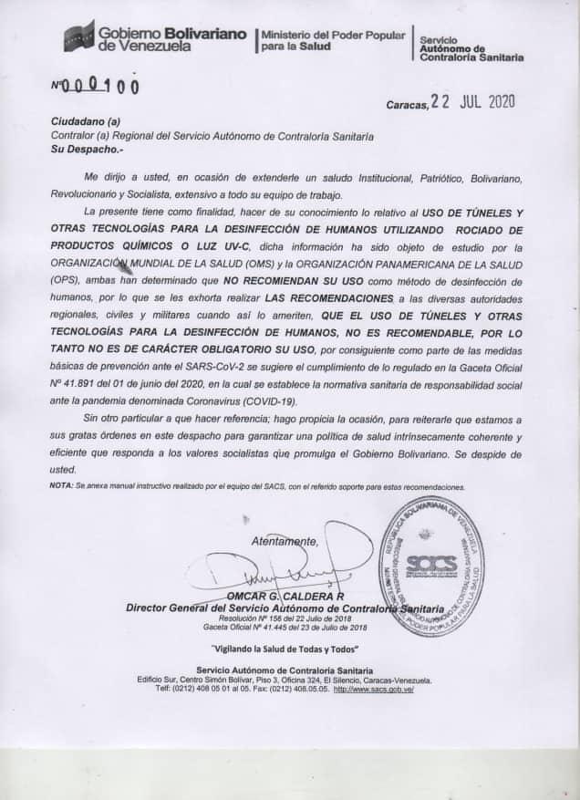 En Venezuela a pesar de andar detrás de la ambulancia en muchas cosas (antiguo dicho de los amantes del hipismo venezolano),y de aplicar medidad IMPROVISADAS a todo nivel y con resultados practicamente ausentes, hoy el Ministerio del Poder Popular para la Salud , emite una «Recomendación» (debería decir prohibición) sobre el NO USO (debería decir prohibición) de esas invenciones populares llamados TUNELES O CABINAS DE DESINFECCION O SANITIZACION, (algunos colegas los llaman TUNELES SATANIZANTES JEJEJEJEJE) que lo unico que han demostrado es que son utiles es en quitarle el dinero a los incautos a razón de 1500-3500 $ (si dólares americanos) por cada «ducha improvisada» de estas en cualquiera de sus variantes con cloro, alcohol, ozono, vapor , y hasta eucalipto, que empresarios incautos han comprado, digamos que por flojera de buscar asesoria profesional (que sale mucho mas economica y es mas efectiva que las duchas) y caen en las manos de estos vendedores de humo enlatado (debería decir ESTAFADORES).