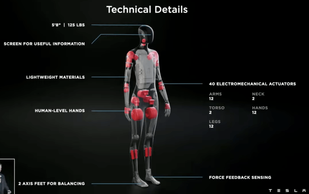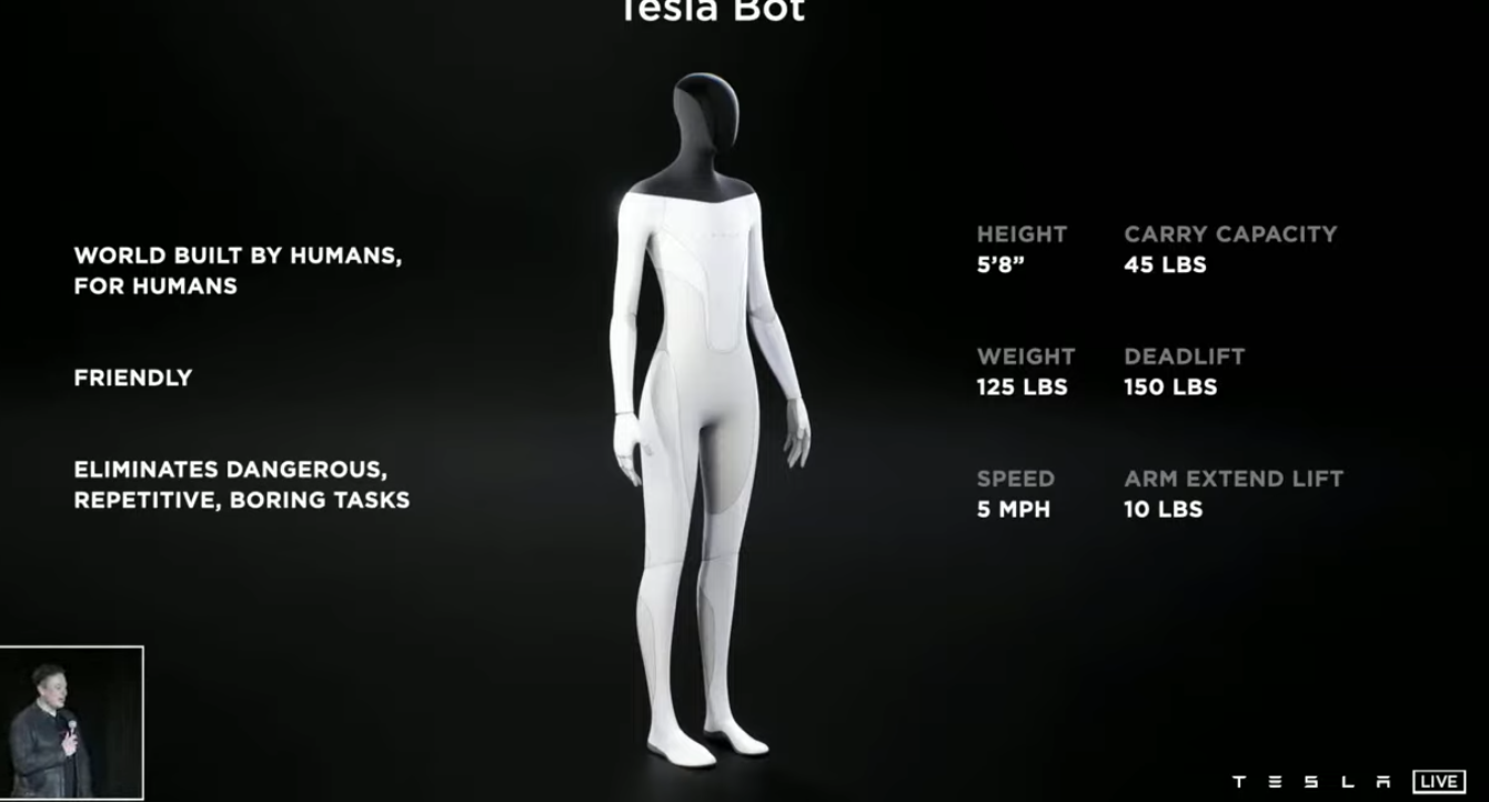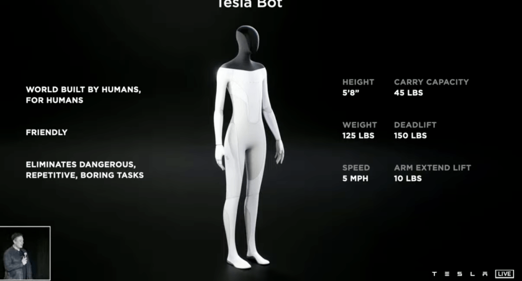 Y aunque lejos de ser completamente autónomo, los sistemas de inteligencia artificial de Tesla son bastante impresionantes. Planean usar esa experiencia para ayudar con tareas menores con el Tesla Bot. De pie mide 1.75 mts y pesa 50 kg, el Bot impulsado por IA, es un robot humanoide ,destinado a aliviar a los humanos de tareas que son peligrosas o francamente aburridas (entiéndase trabajos). Aún en desarrollo temprano, el objetivo es que el robot sea capaz de levantar hasta 45 libras y moverse a una velocidad de hasta 5 mph usando docenas de actuadores escondidos dentro de su elegante caparazón, con una pantalla en la cara para mostrar información o quizás simplemente hacer que parezca menos amenazante.